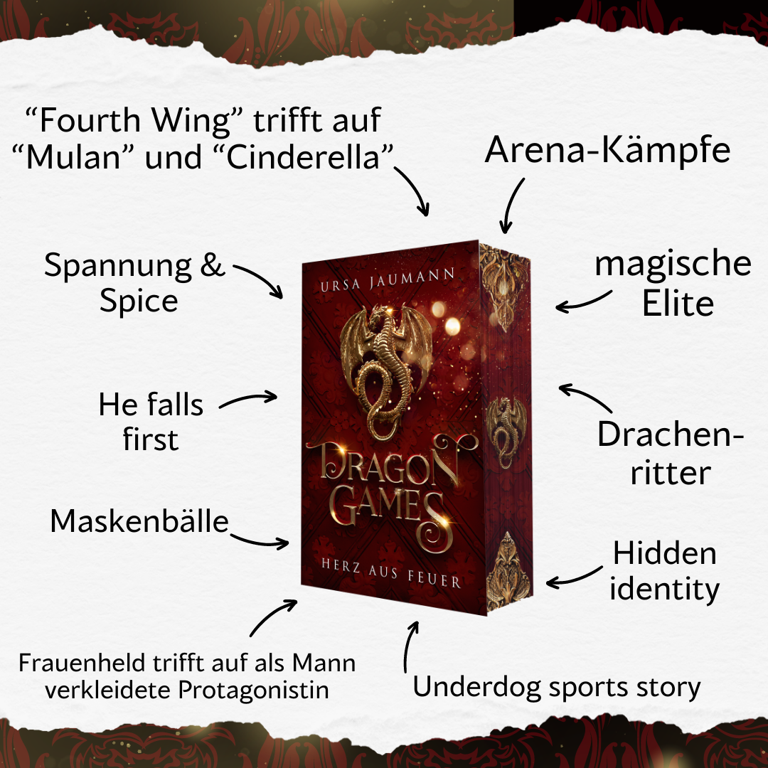 Es handelt es sich um eine wunderschöne Ausgabe mit Farbschnitt* zum Auftakt der „Dragon Games“-Trilogie von Ursa Jaumann, in der „Fourth Wing“ auf „Cinderella“ und „Mulan“ trifft! 🐉