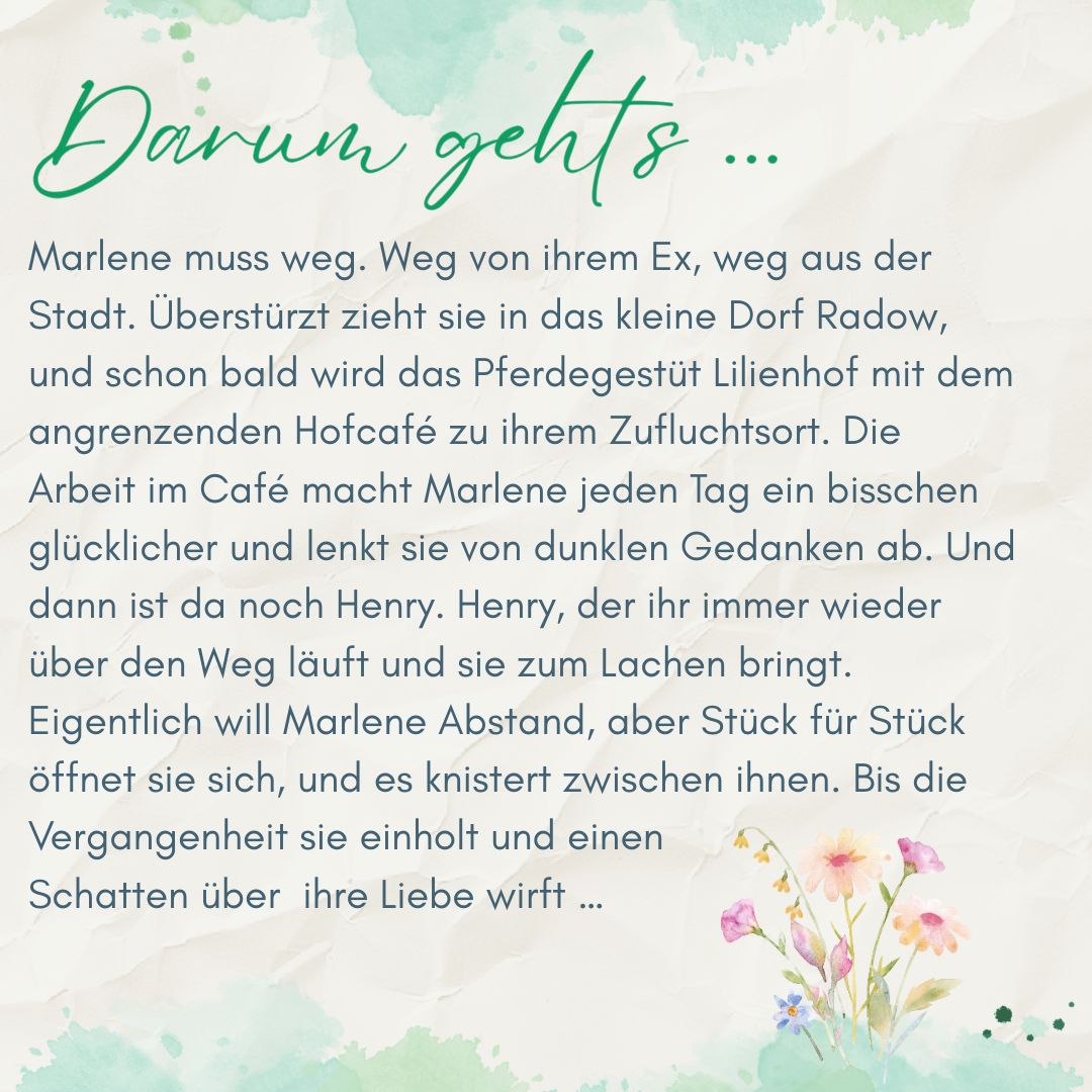 Marlene muss weg. Weg von ihrem Ex, weg aus der Stadt. Überstürzt zieht sie in das kleine Dorf Radow, und schon bald wird das Pferdegestüt Lilienhof mit dem angrenzenden Hofcafé zu ihrem Zufluchtsort. Die Arbeit im Café macht Marlene jeden Tag ein bisschen glücklicher und lenkt sie von dunklen Gedanken ab. Und dann ist da noch Henry. Henry, der ihr immer wieder über den Weg läuft und sie zum Lachen bringt. Eigentlich will Marlene Abstand, aber Stück für Stück öffnet sie sich, und es knistert zwischen ihnen. Bis die Vergangenheit sie einholt und einen Schatten über ihre Liebe wirft …