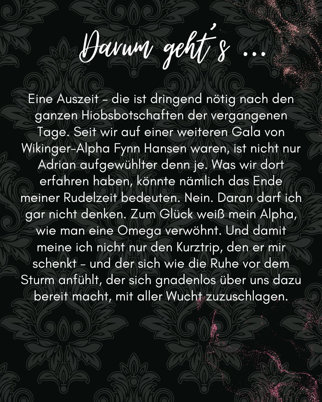 Eine Auszeit – die ist dringend nötig nach den ganzen Hiobsbotschaften der vergangenen Tage. Seit wir auf einer weiteren Gala von Wikinger-Alpha Fynn Hansen waren, ist nicht nur Adrian aufgewühlter denn je. Was wir dort erfahren haben, könnte nämlich das Ende meiner Rudelzeit bedeuten. Nein. Daran darf ich gar nicht denken. Zum Glück weiß mein Alpha, wie man eine Omega verwöhnt. Und damit meine ich nicht nur den Kurztrip, den er mir schenkt – und der sich wie die Ruhe vor dem Sturm anfühlt, der sich gnadenlos über uns dazu bereit macht, mit aller Wucht zuzuschlagen.