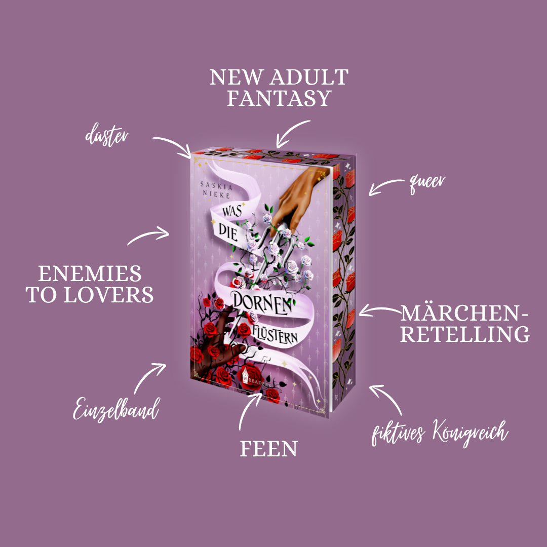 Diese exklusive Ausgabe kommt mit Charakterkarten und einem wunderschön gestalteten Farbschnitt! 🌟 Wir empfehlen „Was die Dornen flüstern“ allen Fans von „Cinderella ist tot“ und „Killing the Beast“, sowie Liebhabern von düsteren Märchen-Retellings und feministischen Fantasy-Büchern. 📚✨ Bitte beachtet die Triggerwarnung: Blut 🩸, Tod ☠️ und Verlust 💔. Das Buch ist für Leser ab 16 Jahren empfohlen. 🔞