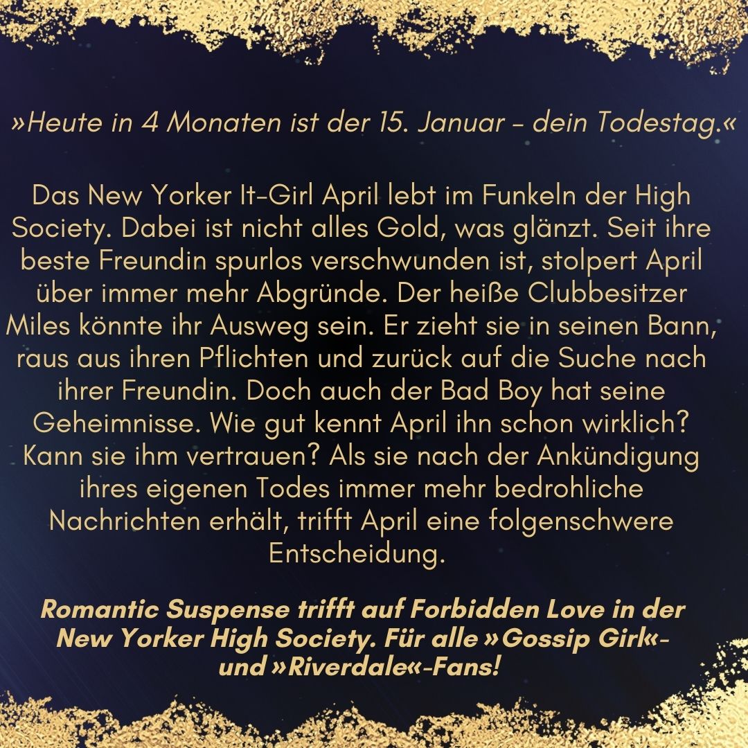 Das New Yorker It-Girl April lebt im Funkeln der High Society. Dabei ist nicht alles Gold, was glänzt. Seit ihre beste Freundin spurlos verschwunden ist, stolpert April über immer mehr Abgründe. Der heiße Clubbesitzer Miles könnte ihr Ausweg sein. Er zieht sie in seinen Bann, raus aus ihren Pflichten und zurück auf die Suche nach ihrer Freundin. Doch auch der Bad Boy hat seine Geheimnisse. Wie gut kennt April ihn schon wirklich? Kann sie ihm vertrauen? Als sie nach der Ankündigung ihres eigenen Todes immer mehr bedrohliche Nachrichten erhält, trifft April eine folgenschwere Entscheidung.