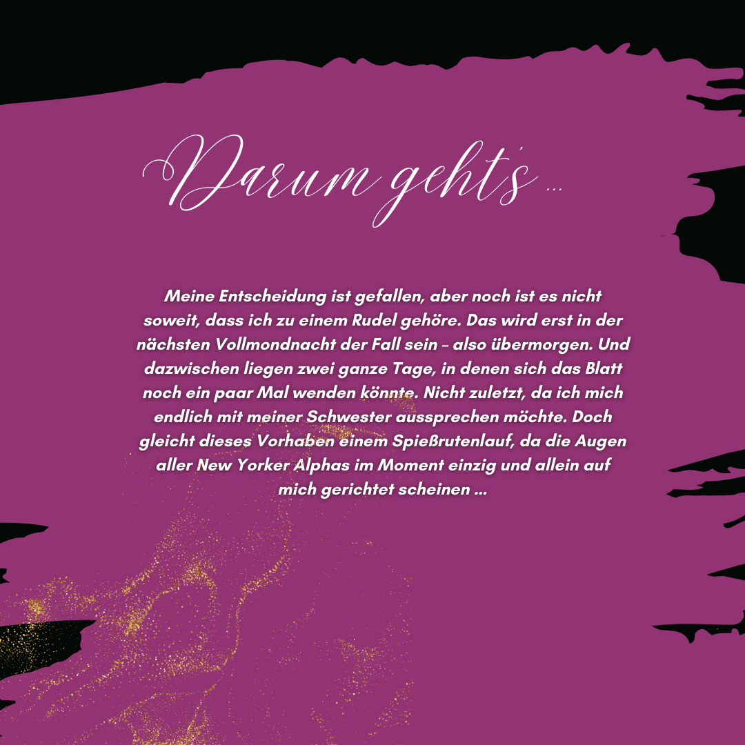 Meine Entscheidung ist gefallen, aber noch ist es nicht soweit, dass ich zu einem Rudel gehöre. Das wird erst in der nächsten Vollmondnacht der Fall sein – also übermorgen. Und dazwischen liegen zwei ganze Tage, in denen sich das Blatt noch ein paar Mal wenden könnte. Nicht zuletzt, da ich mich endlich mit meiner Schwester aussprechen möchte. Doch gleicht dieses Vorhaben einem Spießrutenlauf, da die Augen aller New Yorker Alphas im Moment einzig und allein auf mich gerichtet scheinen …