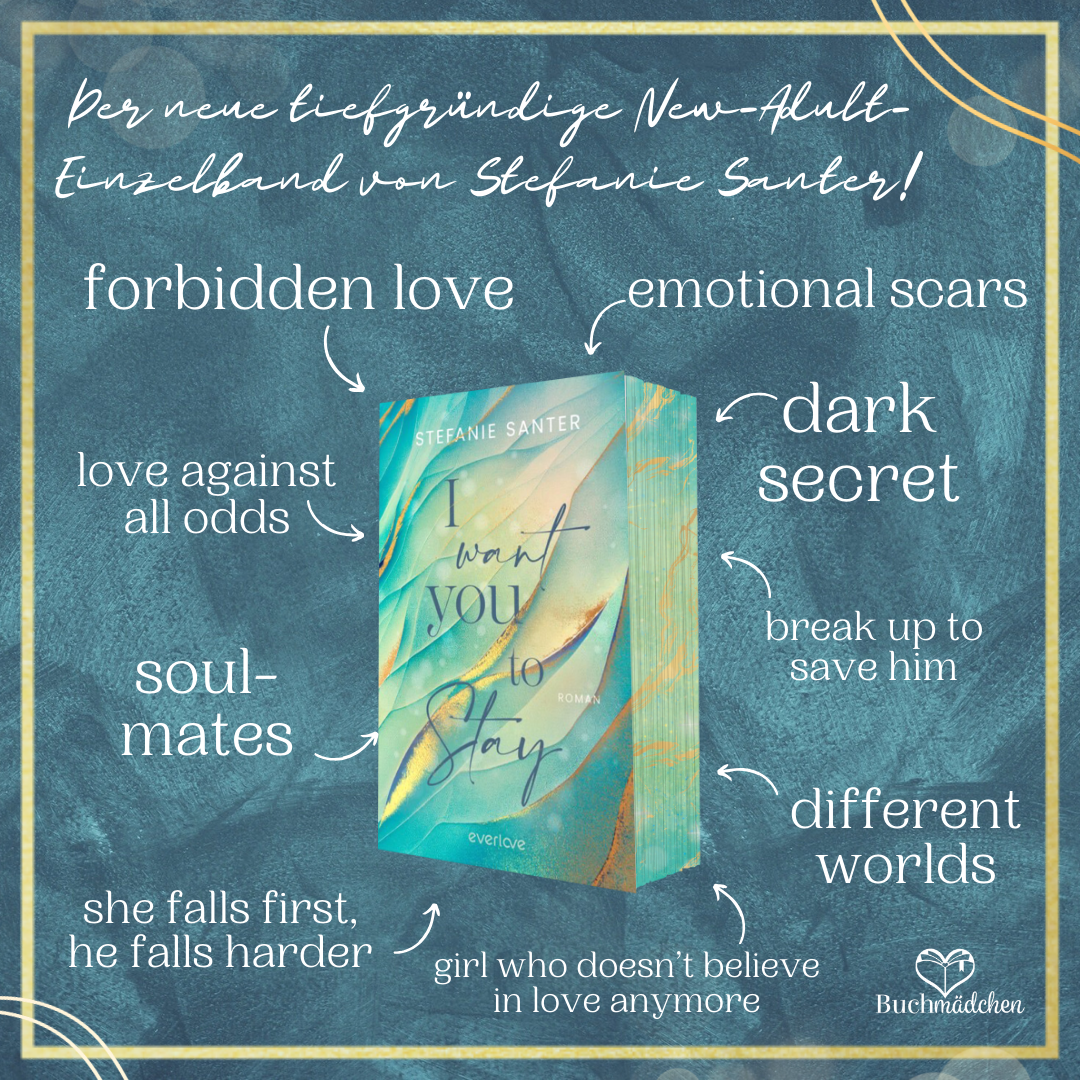 "I want you to stay" ist die schmerzhaft-ehrliche, aber gleichzeitig hoffnungsvoll-romantische Liebesgeschichte von Birdie (die nach einem Unfall wieder laufen lernt) und Nave (einem aufstrebenden Musiker mit geheimnisvoller Vergangenheit), die alles ineinander sehen, außer ihren momentanen Schwächen/Problemen, die ihnen vom Schicksal in den Weg gelegt wurden, und der Gefahr, die ihr Zusammensein letztlich füreinander birgt ... 💔
