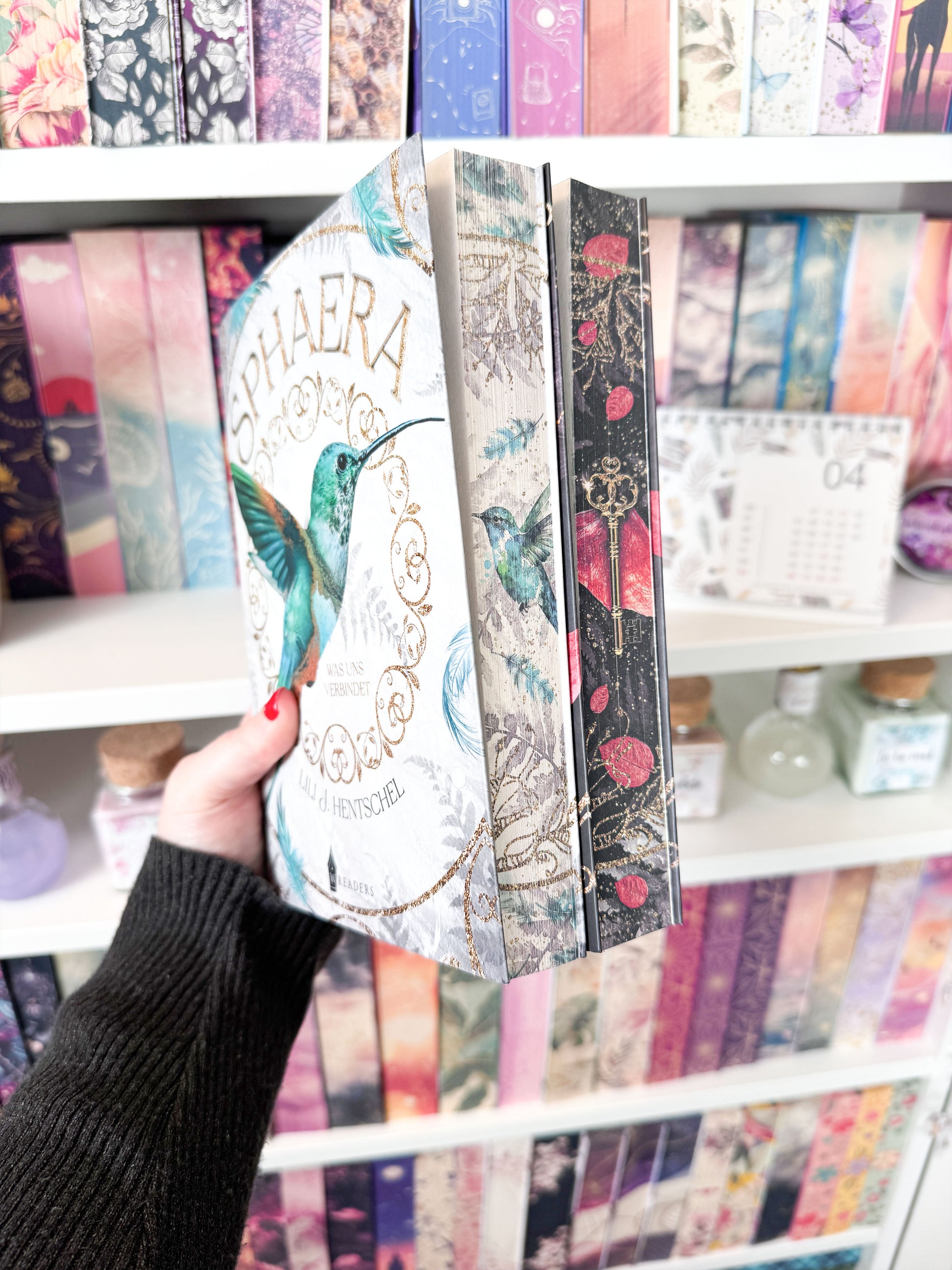 Der Farbschnitt wird mithilfe eines Buchseitendruckers auf das fertig gebundene Buch angebracht. Dadurch können Farbreste auf den ersten oder letzten Seiten oder leichte Streifen im Druckbild entstehen, Kleberückstände o.Ä. auf dem Buch können außerdem nicht deckend überdruckt werden. Diese Fehler keinen Reklamationsgrund dar.