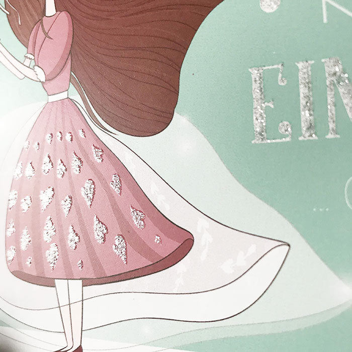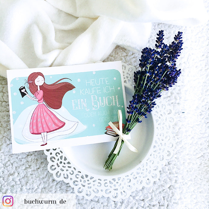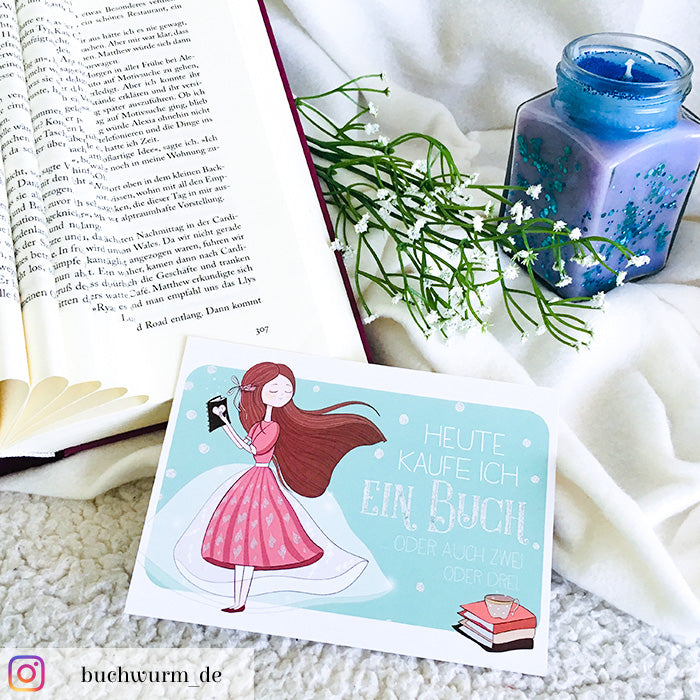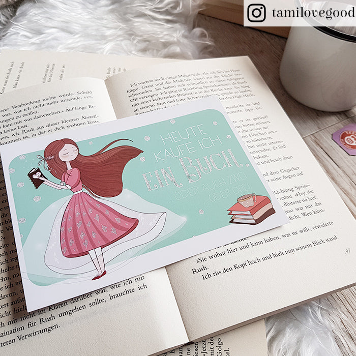 Postkarte mit lesendem Mädchen und »Heute kaufe ich ein Buch. Oder auch zwei ... oder drei.«. Die Karte ist partiell mit Glitzer veredelt.