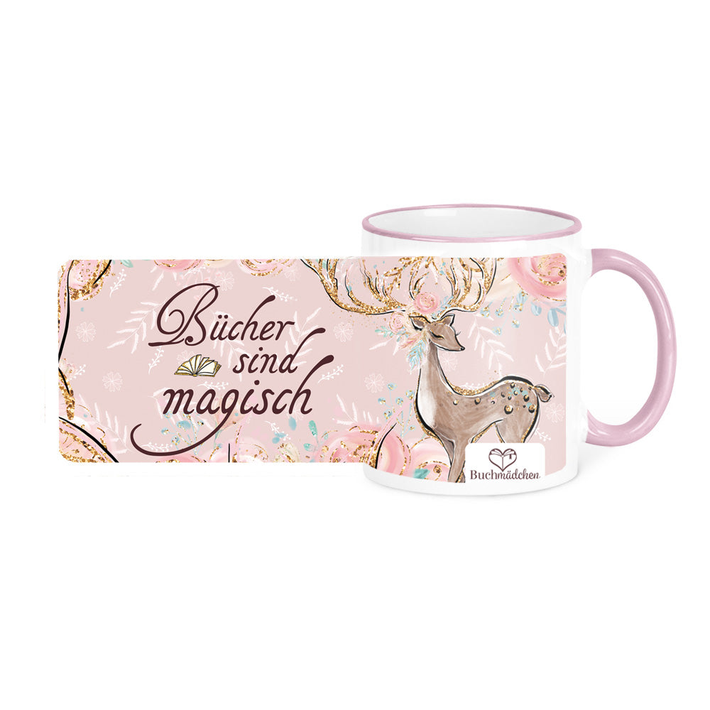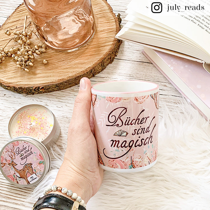 Büchertasse mit rosa Rand, (manchmal Innenseite) und Henkel. Wurde von uns selbst bedruckt ♥